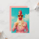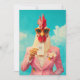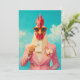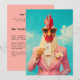 Uma galinha antropomórfica elegante vestindo óculos de sol e um terno rosa floral posa confiantemente contra um cenário de céu sonhador, segurando uma etiqueta em branco.