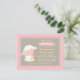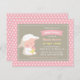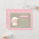 Um belo convite para o chá de fraldas de cordeiro que apresenta um cordeiro branco giro, segurando-o numa garrafa de leite. Espaço de cinza para personalização dos detalhes do chá de fraldas e um padrão de bolinhas branco sobre fundo cor-de-rosa. Excelente de mamãe ser quem espera uma menina.