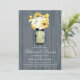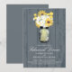 Anúncio do jantar de ensaio do casamento. O fundo no design de madeira do celeiro rústico cinzento médio com um frasco de pedreiro encheu-se com as margaridas brancas, os girassóis e as bolas amarelas de Billy. Se o esquema de cores não é o que você quis por favor me deixa saber e eu recrearei aquele para você mas contactar-me-ei por favor antes de colocar uma ordem. Planeamento feliz do casamento de paula@labellarue.com do email!