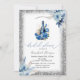 O convite para chás de fraldas bonitos apresenta flores azuis de cor aquosa, garrafa gêmea com flores, e quadro de brilho prateado sobre fundo branco. Esses convites para chuveiros de bebês são facilmente personalizados para seu evento simplesmente adicionando seus detalhes.