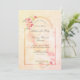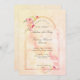 O Pêssego Sunset e os tintos cor-de-rosa quentes lavam-se sobre este convite de casamento de cor-de-água sonhadora. Pintura botânica artística de floração Freesia de cor aquosa. Muito romântico, moderno e moderno, este convite é perfeito para um casamento de feiticeiros com amigos e familiares. É delicado e elegante o suficiente para um tema mais formal com cor de pêssego também. Uma floração e botões de abertura total ajudam a enquadrar o texto na dentro do arco. Além disso, botões delicados e uma lavagem das aquarelas de pêssego do pôr do sol completam a composição romântica. O verso contém as iniciais monográficas do dentro casal a rosa-gold, um quadrado delimitado.