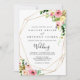 Este convite de casamento geométrico de ouro tropical e de volta é perfeito para um casamento de destino. A design apresenta cor-de-água rosa, esbranquiçada, amarela, azul e branca, que cai em pedras com folhas verdes botânicas, enfeitando uma moldura geométrica. Salve o papel, incluindo mais detalhes na parte traseira do convite em vez de em uma placa de gabinete separada.