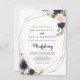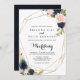 Este convite de casamento floral de inverno geométrico de ouro é perfeito para um casamento simples. O design apresenta flores coloridas de ouro e folhagem verde, amontoadas em belos buquês, enfeitando uma estrutura geométrica artística. Salve o papel, incluindo mais detalhes na parte traseira do convite em vez de em uma placa de gabinete separada.