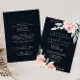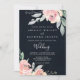 Este elegante convite para casamento floral, cor-de-rosa, é perfeito para um casamento simples. A design apresenta rosas rosas desenhadas à mão e peônias com folhas verdes e cinzas num fundo azul escuro, inspirando beleza natural. Salve o papel, incluindo mais detalhes na parte traseira do convite em vez de em uma placa de gabinete separada.