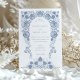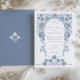 Este elegante convite de casamento mostra um intrincado e pintado à mão design floral em azul mole, com uma fronteira ao estilo barroco que elegantemente enquadra os nomes dos casais e os detalhes do casamento. Os delicados motivos florais acrescentam uma sensação de charme de safra, enquanto a tipografia de serifa moderna proporciona um toque contemporâneo. A parte de trás do cartão apresenta um monograma minimalista adornado com elementos florais complementares, todos colocados contra um fundo azul calmante. Perfeito para casais que buscam um tema de casamento eterno e na moda, esse convite combina a beleza da arte tradicional com a design moderna. A paleta colorida de azul e branco suave adiciona uma sensação serena e sofisticada ao seu dia especial.