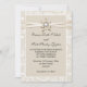 Lace border com o convite de casamento de fita bege que apresenta nódoas e bordas brancas, uma fita de satin e uma flor com brilho metálico e diamante de joia impresso e seu texto em preto em cor de bege de areia. Este modelo personalizável é cheio de elegância chic e finesse. Faz parte de um casamento perfeito para um casamento com uma paleta neutra.