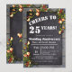 Convite de celebração de aniversário elegante com quadro negro, borda floral e fundo de cerca de madeira. Personalize este convite para qualquer celebração - aniversário, aniversário de casamento, casamento ao ar livre e muito mais.