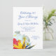 modelo de convite de festas de aniversário de flores do Havaí bonito. O texto azul escuro nos cartões brancos tem um design de flor realista no canto inferior. Um hibisco rosa brilhante, flores de plumeria branca e um pássaro-do-paraíso exótico constituem o design buquê. A formulação funciona durante vários anos. O reverso é azul escuro sólido. Esta é uma placa de 5 x 7 polegadas com alguns outros tamanhos disponíveis e escolha entre muitas belas atualizações de papel.