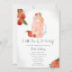 chá de fraldas de temas lisos de fruta com ilustração da suavização de pêssego com morango. Texto diz, "Um pouco de pêssego está a caminho"