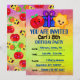 Apenas algumas frutas felizes adoráveis para fazer aniversários convidam todo sol e arco-íris. Use o botão personalizar azul para alterar o texto e personalizar ainda mais para ajustar os tamanhos. Esperamos que a sua celebração escolhida seja com muito amor, risos e doces! A design apresenta uma maçã apetitosa, um abacaxi espumante, um sol radiante e muita beleza. Tenha um excelente de dia e uma maravilhosa diversão de festival. Caso contrário, fofoca, sabe qual é a bebida mais útil em festas? Lemon-aid! :-) hu hu hu!