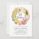 Um chá de fraldas de coroa tropical colorido que inclui uma coroa aquosa de abacaxi, kiwis, abacates, citrinos, papaias, libélulas, figos, romãs, damascos e bananas. Personalize adicionando nomes e outros detalhes do evento. Este convite de coroa fruta tropical é perfeito para chás de fraldas de verão.
