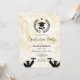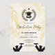 Um fundo moderno e elegante, com temas de graduação, que inclui silhuetas negras de formandos com diplomas de um bege marmoreado e pano de fundo branco. A design é coroada com uma coroa de louros, um boné de formatura e um ícone do diploma, perfeito para convites.