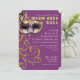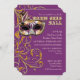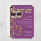 PALETA DE CORES: profundamente - roxo, olhar metálico do ouro, olhar de prata do metal e COLEÇÃO preta do DESIGN: Uma máscara Venetian do partido do vintage para uma bola de mascarada jeweled com flourishes elegantes, clássicos do redemoinho do rolo em um brilho dourado do falso com grupos de uma faísca do twinkling fora deste convite do estilo do bilhete que setup com fraseio fundraising como uma opção. É fácil mudar para fora para seu próprio fraseio se necessário usar o modelo coloca. O verso tem o teste padrão de roda do estilo do damasco.