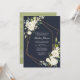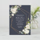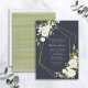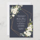 Um funeral elegante ou um convite de memorial moderno, com flores brancas de cor d'água, elementos de design geométrica de cobre em azul marinho, com textura verde de cor d'água. Copyright Elegant Invites, todos os direitos reservados.