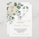 Um buquê floral em cores neutras e folhagem das folhas é a base para este elegante e costume convite ao funeral cristão. Verduras suaves e azuis com sotaque de manchas de ouro flutuando através do design. Altere facilmente as informações para o seu próprio convite personalizado.
