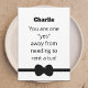 This funny groomsman card can be a digital download, a paper greeting or both. The design features a bowtie along the bottom with the name of your future groomsman customized along the top. Below his name are the words, "You are one "yes" away from needing to rent a tux." Inside the card are the words, "Will you be my groomsman?" Concept and image Copyright Kathy Henis