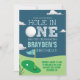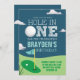 Um "furo colorido em um" convite temático do aniversário do golfe primeiro ajudar a comemorar o primeiro aniversário do seu rapaz pequeno. A paleta de cores caracteriza máscaras do verde contra um céu azul profundo. Por favor mensagem mim para pedidos feitos sob encomenda.