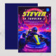 Get ready to race into the ultimate celebration! This futuristic go-kart birthday invitation features a high-speed racing theme with a vibrant synthwave aesthetic. The design showcases a driver in a sleek kart, zooming through a glowing neon track under a digital sunset.