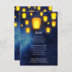 Um cheio noturno estrelado de ouro iluminado, lanternas flutuantes define a cena de um belo top-off para uma celebração neste cartão único. Use como cartão de acomodação, cartão de informações de recepção ou cartão de informações de registro. Faz uma impressionante impressão para o seu casamento, casamento só de recepção, janto de ensaio, comemoração de Diwali, aniversário, chá de panela, chá de casal ou festa de aniversário. Disponível com produtos correspondentes.