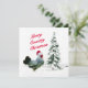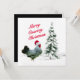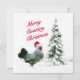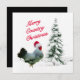Divertimento para baixo home e galinha festiva, do país na neve que veste um chapéu e uma posição do papai noel por um pinheiro coberto de neve.