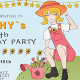 Menina de jardinagem bonita com convite de aniversário de flores. Um desenho de uma garota com flores em uma lata de água com estrelas amarelas brilhantes e girassóis. Na parte de trás está um padrão de girassol. Adicione seu texto e faça um convite de aniversário divertido para a garota.