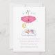 Chá convite cor-de-rosa para uma menina adormecida, com uma menina adormecida numa nuvem, uma lua crescente e uma estrela sobre ela e um guarda-chuva rosa com gotas de água. As costas incluem um padrão de bebê. Alguns elementos de Trina Clark e cortesia de vectorportal.com.