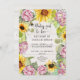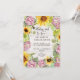 Formato vertical 5x7. "Menina para Bee Sunflower Pink Hydrangeas Convite para chá de fraldas." Design doce, fazenda de campo ou celeiro com mamangabas sobre um fundo macio de madeira branca. Girassóis, margaridas e flores cor-de-rosa poeirenta de hidrangea, de verão, com vegetação sensual e folhas de eucalipto. Arte pintada em aquarela pela artista e designer internacionalmente licenciada, Audrey Jeanne Roberts, copyright.