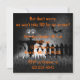 Uma menina diabólica reluzente, com chapéu de bruxa e garfo num fundo preto e branco, com lua de cheio, morcegos e gato preto. Um dos lados oposto, um espantalho mau com a cabeça de abóbora no cemitério com morcegos voando em torno de um efeito preto e branco forte. Perfeito para uma festa de Halloween assustadora!