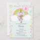 Esta doce e bonito monocórnio com pele escura, cabelo roxo e uma banda de ouvido unicórnio com rosas e uma margarida e ouro com brilho de ouro segurando um balão de aniversário é a forma perfeita de celebrar um dia mágico e especial. Este convite de aniversário unicórnio pode ser personalizado com a idade da aniversariante no balão rosa. Um arco-íris bolinhas e estrelas confetti completam este olhar feliz e divertido. O dorso tem listras cor-de-rosa, verde limão, azuis, roxas e amarelas com um padrão de bolinhas © Chrissy H. Studios, LLC. Todos os direitos reservados.