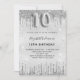 Um convite moderno, na moda e glamouroso para a 10ª festa de aniversário de uma menina. Um fundo com aparência de prata falsa, decorado com poeira brilhante. Personalize e adicione o seu nome e detalhes da festa. O número 10 é escrito com uma fonte de estilo de balão, script.