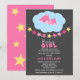 © 2013 Designs socialitas. Urso de pelúcia rosa bonito dormindo em um convite para chá de fraldas de nuvem para uma menina. A design também tem um cartaz de estrela e um texto de menina pendurado na faixa. A parte de trás do convite tem um fundo cor-de-rosa com estrelas amarelas de grande tamanho. Todos os elementos de design podem ser movidos, redimensionados ou excluídos para se adequarem ao seu evento.