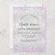 Um convite de aniversário moderno, elegante e minimalista. Fundo de aspecto fino prateado decorado com faíscas de brilho púrpura e borboletas e borboletas como marca d'água. Personalize e adicione seus nomes e detalhes do casamento. Letras pretas coloridas.