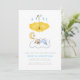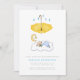 O bebê adormecido chá convite amarelo, com um bebê dormindo na nuvem, uma lua crescente e uma estrela sobre ela e um guarda-chuva amarelo com gotas de água. As costas incluem um padrão de bebê. Alguns elementos de Trina Clark e cortesia de vectorportal.com.