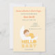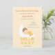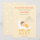 Um pequeno menino está a caminho! Uma nova aventura está prestes a começar! Vamos chá a futura mãe! Este convite para o chá amarelo-bebê, mínimo mas atrativo, é perfeito para a ocasião. Ele apresenta um bebê dormindo na lua em amarelo e laranja. No verso, há um padrão amarelo macio de coisas para bebês silhuetas: uma garrafa, um chocalho, um pacificador, um coração, e um pato de borracha. Este modelo de convite para chá de de bebê pode ser facilmente personalizado com os detalhes do seu chá de fraldas, e você pode alterar a fonte, o tamanho ou a cor de qualquer texto, com exceção de Hello Baby.