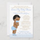 Dirigir por chá de fraldas com um adorável menino afro-americano vestindo máscara e roupa azul-clara em um fundo azul pastel e ouro. Esse garoto giro por chá de fraldas é facilmente personalizado para seu evento simplesmente mudando o texto. Você pode alterar a cor do texto, escolher o estilo da fonte, o texto, etc.