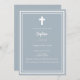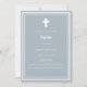Fundo azul empoeirado, decorado com um quadro branco, e uma cruz branca Personalize e adicione o nome e os detalhes. Texto branco.