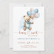 Convite para primeiros aniversarios, com ursinho de pelúcia bonitinho, com balões azuis e castanhos de pasta e com a menção "Beary Sweet". Cor azul clara no fundo do convite.