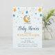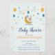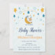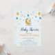 Um belo chá de bebê convoca um adorável bebê e estrelas amarelas azuis num fundo azul. Esses convites para chuveiros de bebês são facilmente personalizados para seu evento simplesmente adicionando seus detalhes de evento.
