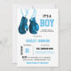 Um tema especial de boxe (box) sobre cartões de convite para chuveiros de bebês incríveis. Fundo branco com luvas de boxe em azul. Duas cores diferentes azul e branca. Placas de modelo editáveis para que você possa adicionar suas informações. Obtenha autocolantes para os seus favores de presentes.