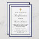 Um convite moderno, elegante e de confirmação. Um fundo branco decorado com quadros azuis reais e uma cruz ouro. Personalize e adicione um nome e detalhes. Letras pretas coloridas.