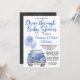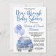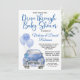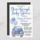 Dirigir através do convite do chá de fraldas com carro azul giro e balões em um fundo de ponto preto e branco. Esta unidade de covid fofa através do convite do chá de fraldas é facilmente personalizada para o seu evento simplesmente adicionando os detalhes do seu evento.