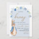 Salto na doçura com este adorável convite para Chás de fraldas de coelhinhos. Apresentando um belo coelho inspirado por Peter Rabbit em um casaco azul macio, delicado florais de aquarela, e um roteiro elegante, este convite é perfeito para celebrar um menino. O quadro arquivado e o estilo clássico do livro de histórias trazem um toque eterno e caprichoso ao seu chá. BBS1014