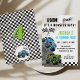 Garoto Verde Azul Fluorescente Monster Monster Truck Convite Monster Caminhão de Aniversário O convite de aniversário para garoto com um caminhão verde fluorescente e azul, bandeiras de corrida e padrão de pranchas de xadrez. Pode ser utilizado em qualquer idade.