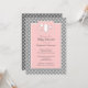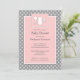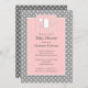 Imagens doces em branco de uma garrafa, uma pacificadora, e um chocalho adoram este bonito convite para chás de fraldas em cor-de-rosa-menina e cinzas de moda.