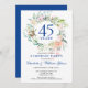 Com uma delicada guirlanda de verde floral em aquarela, este convite de aniversário de casamento de 45 ou 65 anos de festa surpresa botânica elegante pode ser personalizado com as informações do seu aniversário de casamento de safira. O verso apresenta uma guirlanda floral correspondente emoldurando as datas de aniversário em texto branco elegante em um fundo azul safira. Concebido por Thisisnotme©