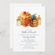 Tema "garrafas e brunch" do chá de fraldas Brunch com aquarela inspirada Ilustração de duas pilhas de panquecas com xarope de cobertura, chocolate e fruta.
