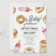 Tema de brunch de chá de fraldas com Garrafas e Bagéis, com Ilustração de um bagel incorporado ao design "oh baby" com biberões cor-de-rosa e ilustrações do bagel ao redor. Design de fundo é azulejo de metrô.