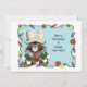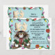 Um gato que foi vestido pelos seus humanos em chifres e outros traje de Natal. Luzes de Natal, ornamentos e flocos de neve fazem fronteira com o convite.