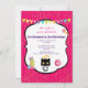 Um convite de aniversário infantil (ou jovem no coração adulto). O plano de fundo é um padrão listrado rosa quente com brilho dourado sujo espalhado. O meio tem um quadro rico preto e branco onde você pode personalizar facilmente seus detalhes de festa. O quadro é decorado com uma faixa colorida de bunting, alguns doces festas gostam de rosquinhas de sorvete e macarões. Um gato preto e branco bonitinho com um halo ouro senta-se no fundo. excelente para um gatinho de aniversário temático.