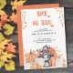 Crianças de halloween truick ou tratem convite de aniversário com letras assustadoras - personalizem para qualquer idade. A aquarela cai no tema design com gato preto giro na bruxa, sentada em um bonito pedaço de abóbora.
